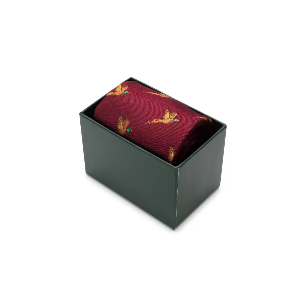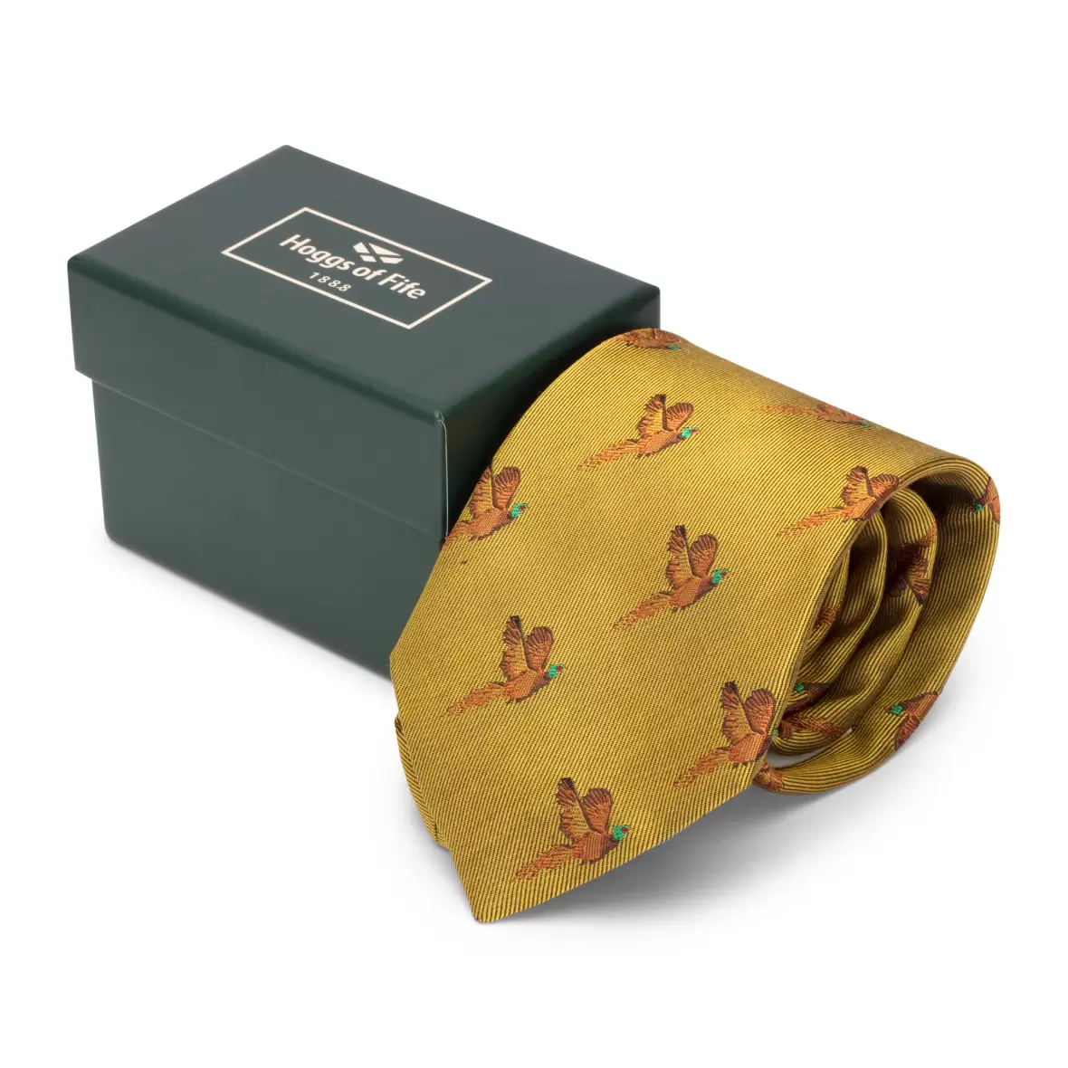 Hoggs of Fife silkeslips med klassisk mønster af 'flyvende fasan', vævet ind i silken, og i fire stærke farvemuligheder. Dette kvalitetsslips leveres i en robust, specialfremstillet gaveæske og er en perfekt gave til jægeren, som han vil værdsætte i mange år fremover!