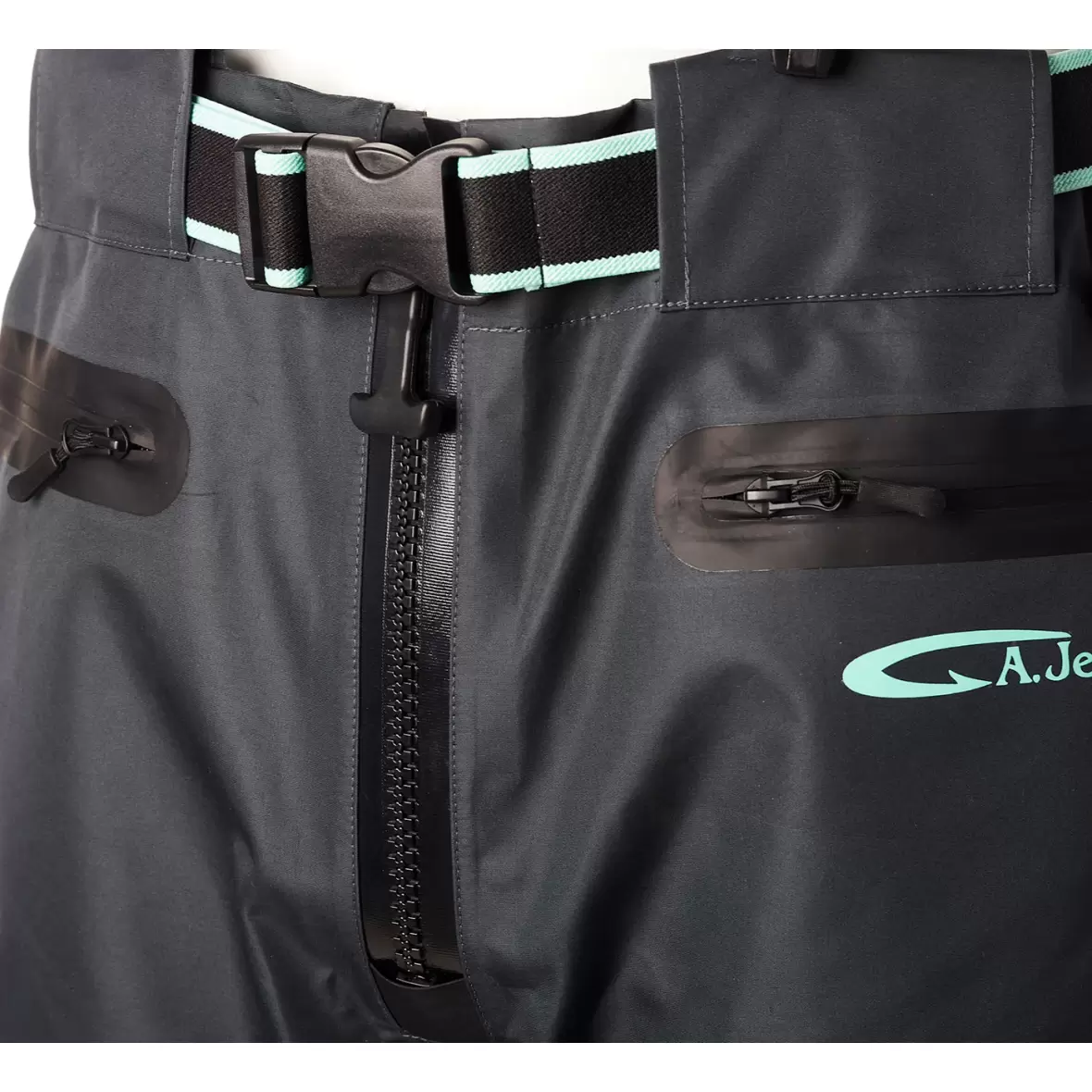 Dette er en wader med lynlås, hvor A. JENSEN har brugt en ægte vandtæt lynlås – ikke en vandafvisende! Tjek den, og du vil straks se og mærke forskellen i forhold til de almindelige vandafvisende lynlåse.