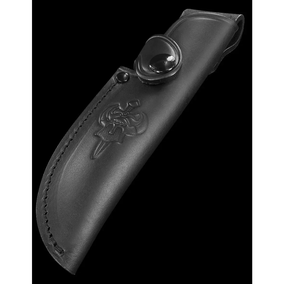 Skaftet er fremstillet i smukt, lagdelt læder med dekorative indlæg, som giver et sikkert og komfortabelt greb – selv under våde forhold. Sammen med den medfølgende håndsyede læderskede får du en kniv, der både er funktionel og æstetisk i topklasse.