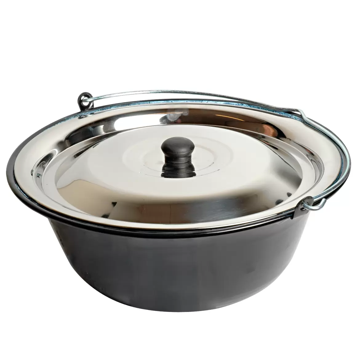 Gryden er af blå emalje indvendig og sort emalje udvenig.
